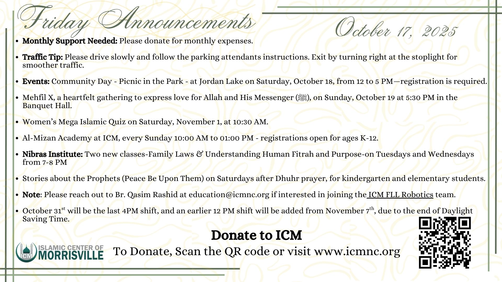 Friday, October 17, 2025 4 shifts held @ ICM Multipurpose Hall 101 Quail Fields Ct, Morrisville, NC 27560 | ||
