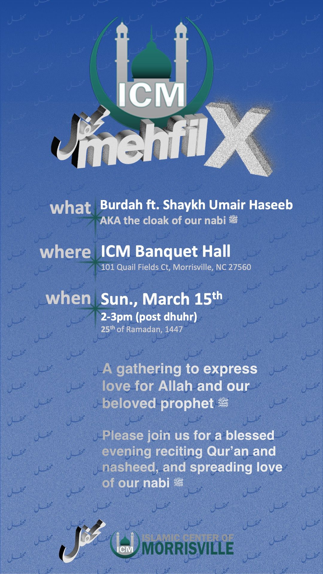 The Islamic Center of Morrisville sends you our heartfelt wishes for a Ramadan filled with mercy, forgiveness, and abundant blessings.