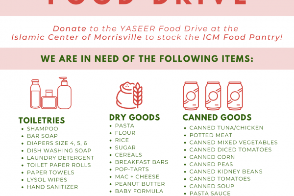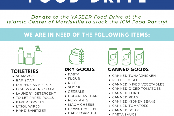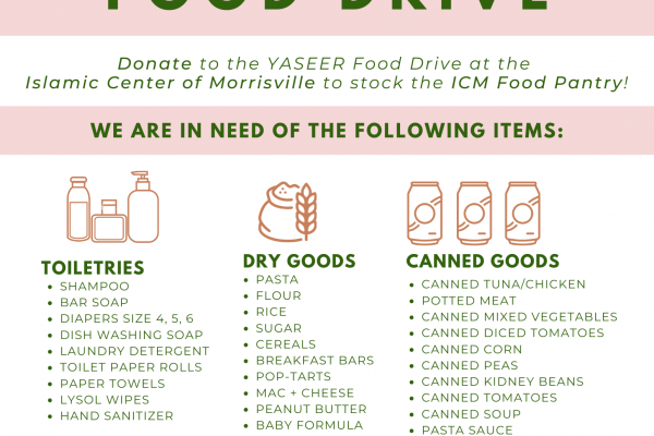 The Islamic Center of Morrisville and YASEER are hosting a food drive to restock the ICM Food Pantry. We are collecting non-perishable food and household supplies to be distributed to those in need. Boxes will be placed outside of ICM for collection 10am to 4pm on Saturday, January 30th and Sunday,...