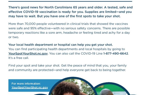 Vaccine providers are ready to expand vaccinations to all health care workers and anyone 65 years and older. NC DHHS has provided us with resources to help you to learn more about getting the vaccine here in NC: Older North Carolinians, You Have A Spot, Take Your Shot (English / Spanish / Captioned) Reverend Governor Jim...