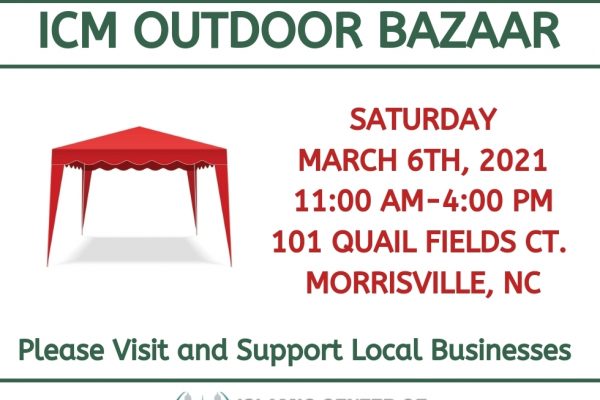 The Women’s Committee of the Islamic Center of Morrisville is inviting everyone to the monthly Outdoor Bazaar. Date: Saturday, November 21st Time: 11am to 4pm. Address: 101 Quail Fields Ct. Morrisville, NC. Vendors are welcome to participate with us this month. Please fill out the registration form and pay the...