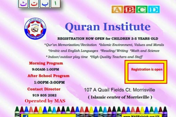 The Islamic Center of Morrisville is now home to MAS Quran Institute, a preschool for our youth age 3 -5 years old. This preschool operates Monday to Friday from 9:00 am. For more information, contact the director at 919-805-2082.