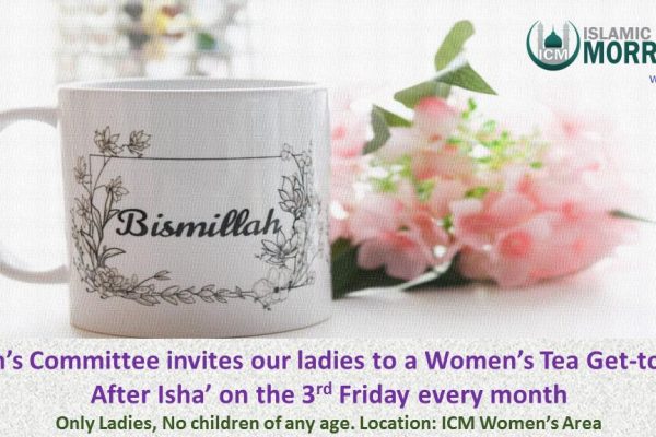 Assalamualaikum sisters! The Women’s Committee at ICM is inviting you for tea after Isha Prayer on Friday February 15. This month, Sr Zareen will be giving a presentation to the community on her experiences while visiting a Rohingya refugee camp. In sha’Allah we will hold a tea for ladies only...