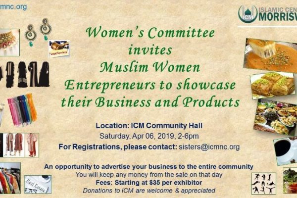 Are you a Muslim Woman with her own business? Would you like to show everyone what you have to offer? The Women’s Committee at the Islamic Center of Morrisville will be hosting an event just for you on April 6, 2019 in sha’Allah. Each vendor must be fully registered to...