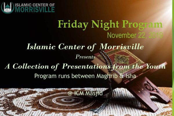 ICM Education Committee presents a Friday night program on November 22nd. The program will run between Maghrib and Isha and will feature presentations from our own youth on various Islamic topics and Quranic stories. Please attend and support your children
